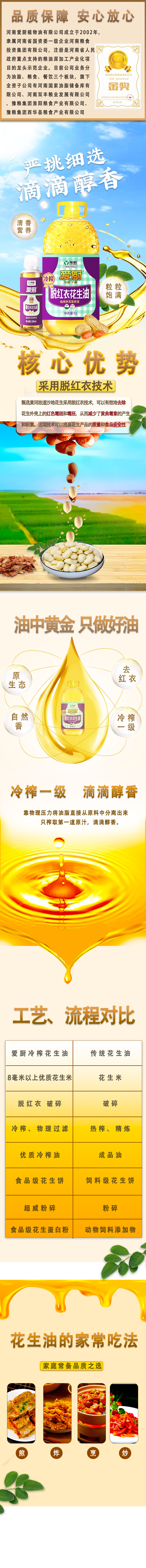 選取優質花(huā)生(shēng)作(zuò)為(wèi)油料,去(qù)除“紅(hóng)衣”,再利用(yòng)“純物(wù)理(lǐ)低(dī)溫冷(lěng)榨”技(jì)術(shù),&在低(dī)于60°C的(de)環境中将花(huā)生(shēng)油壓榨出來(lái),保證營養成分(fēn)不(bù)被破壞。